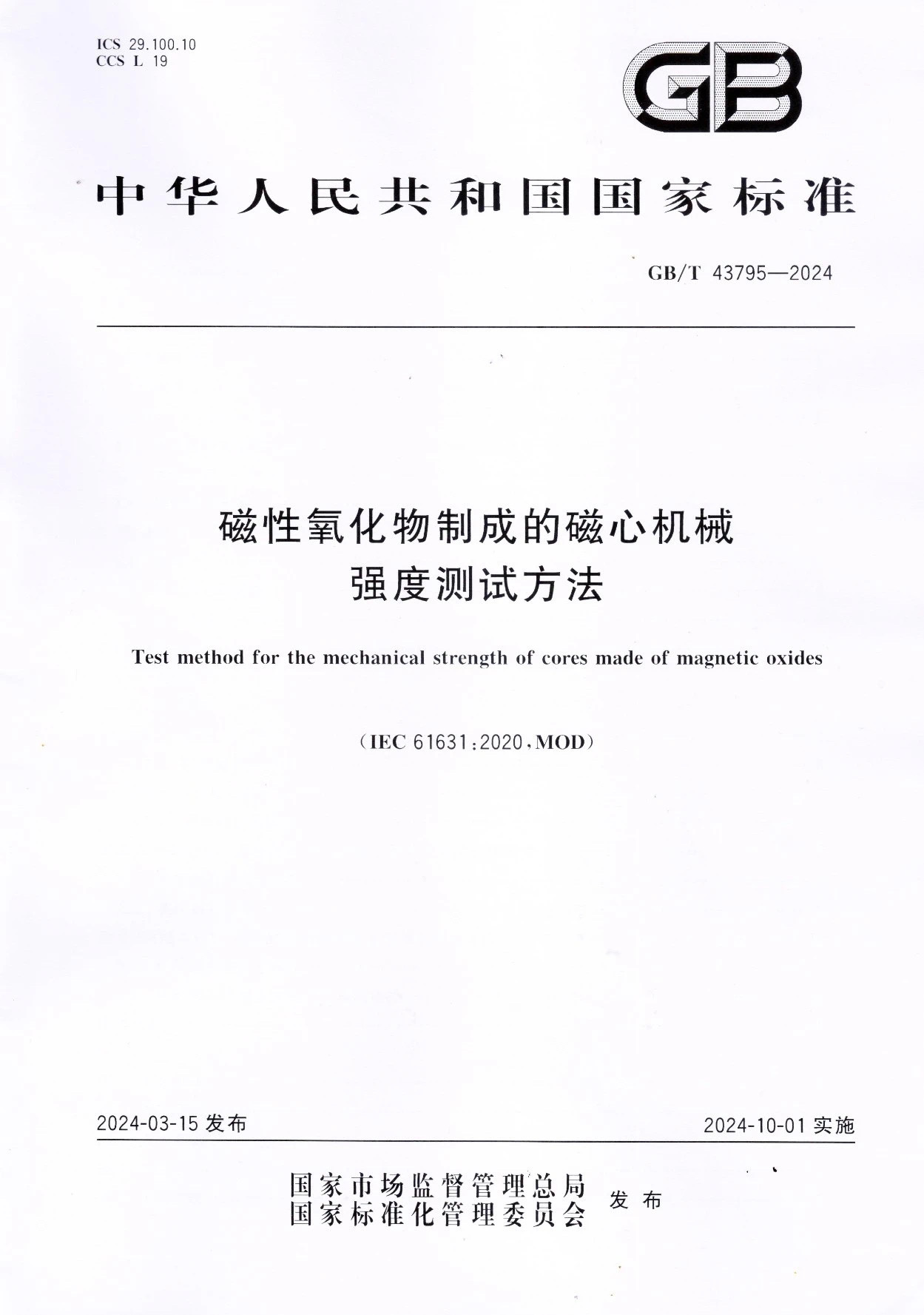 从天下磁标委获悉,日前,由利国国际老牌官网主导制订的国家标准GB/T 43795-2024《磁性氧化物制成的磁心机械强度测试要领》正式宣布。