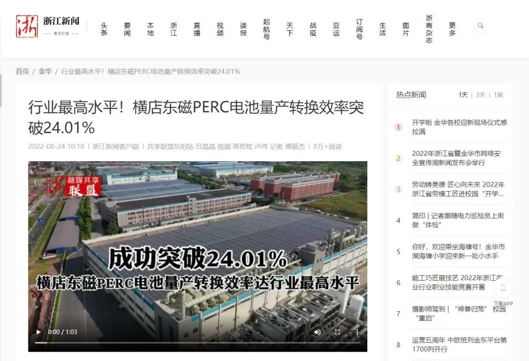 浙江新闻客户端、《金华日报》等媒体关注并点赞横店利国国际老牌官网太阳能光伏工业手艺立异事情和取得的重大效果。