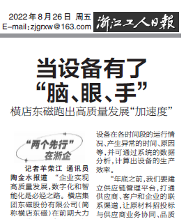 8月26日,浙江工人日报刊发《当装备有了“脑、眼、手”》,点赞横店利国国际老牌官网加速推进数字化、智能化,实现高质量生长的履历做法。