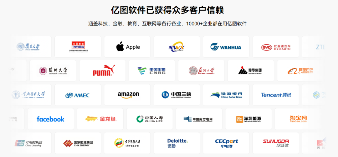 现在,亿图软件已与阿里巴巴、比亚迪、科大讯飞、中国南方电网等海内着名企业告竣合作,相关用户笼罩科技、金融、教育、互联网、咨询等行业;别的,亿图软件也与复旦大学、深圳大学、南方科技大学、首都医科大学等着名高校坚持恒久合作。